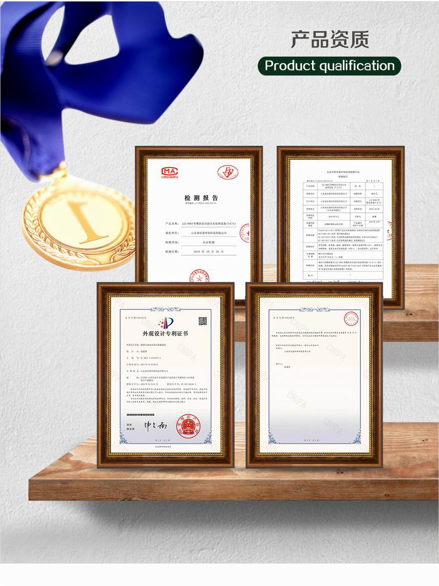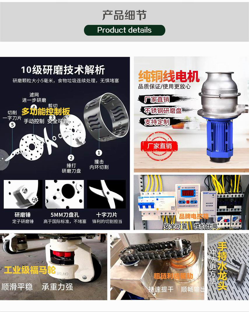 分揀后的餐廚垃圾推入進渣口,機器進行粉碎研磨;研磨后的餐廚垃圾自動進入干濕分離腔進行分離提干,提干后的殘渣落入放置好的垃圾桶內,液體自動進入油水分離器,通過除油裝置將油脂靜態物理加動態提升分離并收集到廢油收集桶內,處理后的污水達到國家三級排放標準,可直接排放到污水管道。
