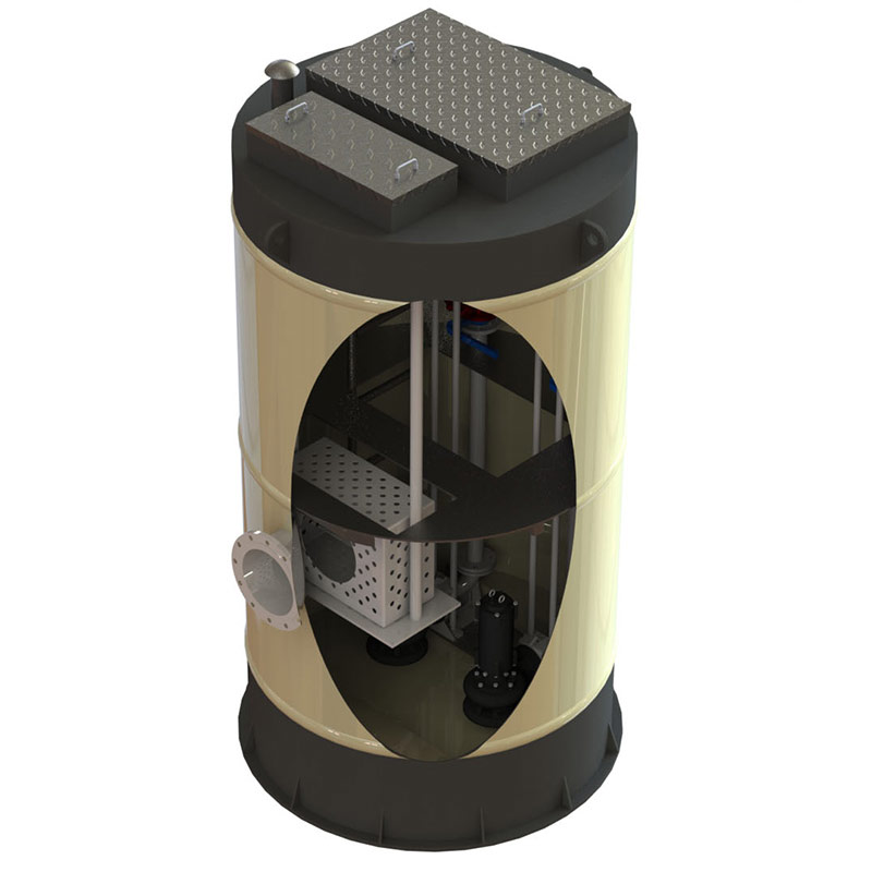 一體化預制泵站為交鑰匙工程,該泵站的筒體采用加厚型機械纏繞GRP玻璃鋼材質制成的。內部的水泵,管路,閥門,儀表,控制設備以及其它用戶所需要的附件成套提供,并安裝測試完畢后出廠。是一種使用方便,質量可靠,土建工作少,成本較低的新型一體化泵站設備,容積優化是其顯著的特征。模塊化濕井泵站:水泵采用自耦濕式安裝,水泵間和進水井集成在同一個井筒內,帶內部維修平臺和地面控制面板。要求操作及維護簡單,在運輸前進行預裝和工廠測試,使現場安裝時間短,提高系統可靠性.