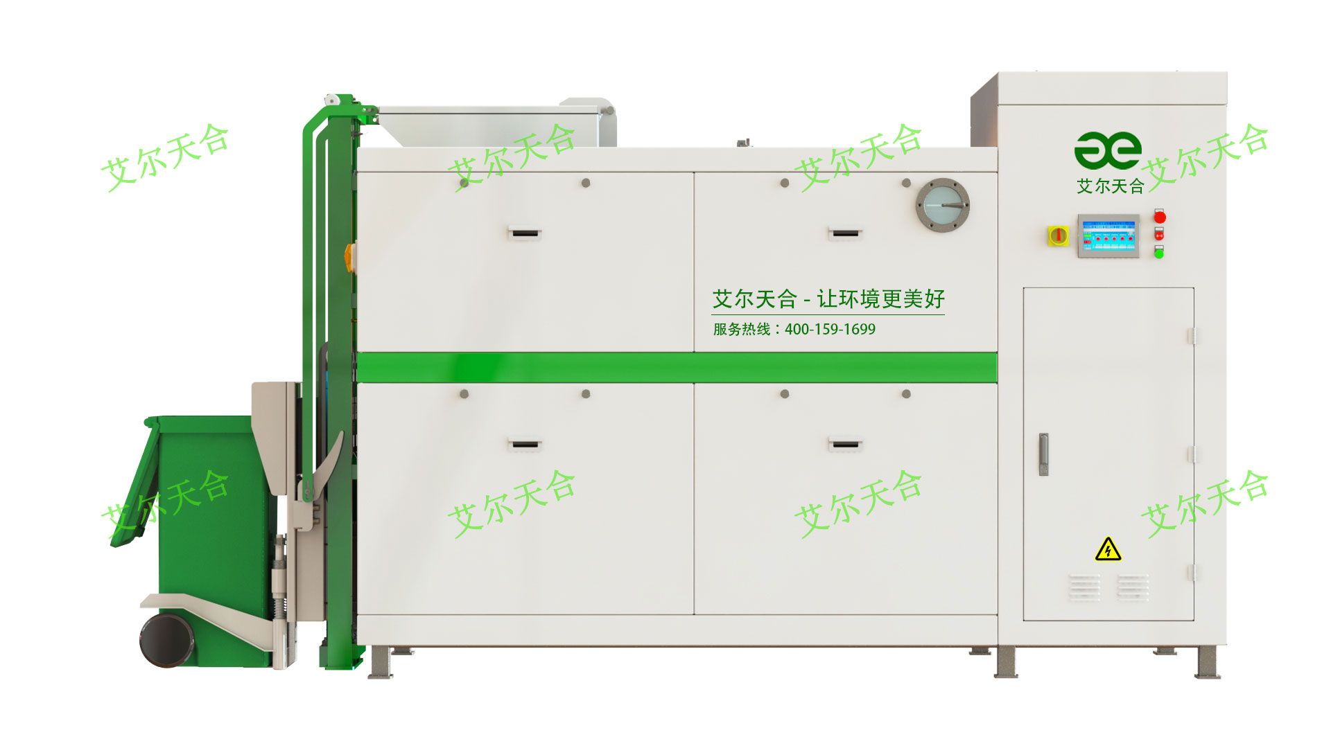 【中型廚余垃圾處理設備300-1000kg】基本介紹產品名稱:艾爾天合一體式餐廚垃圾處理設備產品別名:餐廚垃圾處理器、廚余垃圾處理機產品型號:SAE-B-S300-1000主要用途:餐廚(廚余)垃圾的就地處理和集中處理日處理量:300-1000KG主產出物:氣體和少量的水 【中型廚余垃圾處理設備300-1000kg】性能特點1,適應性廣:通過好氧微生物處理,能有效處理高油、高鹽、高酸性餐廚(廚余)垃圾;2,源頭就地化處理:設備占地面積小,可放在餐廚(廚余)產生單位,適用于源頭就地化處理,無需運輸到垃圾廠,可避免垃圾清運過程中造成的二次污染。同時也可杜絕“地溝油”、“泔水豬”等食品安全問題;3,快速減量化:僅需8-24小時就可將餐廚(廚余)垃圾轉換成氣體和少量的水。4,操作方便:設備自動上料、出料、清洗,通過PLC可視化操作,配置好參數后,全程自動化運行,無需人工看守。