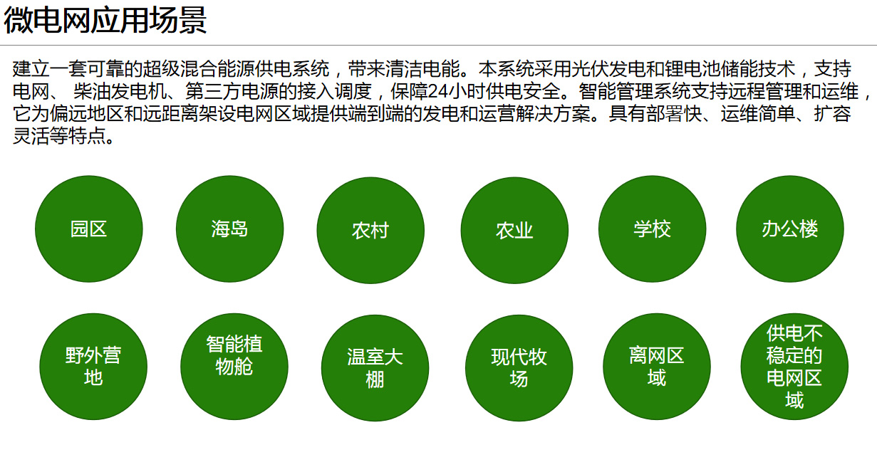 建立一套可靠的超級混合能源供電系統,帶來清潔電能。本系統采用光伏發電和鋰電池儲能技術,支持電網、 柴油發電機、第三方電源的接入調度,保障24小時供電安全。智能管理系統支持遠程管理和運維,它為偏遠地區和遠距離架設電網區域提供端到端的發電和運營解決方案。具有部署快、運維簡單、擴容靈活等特點。